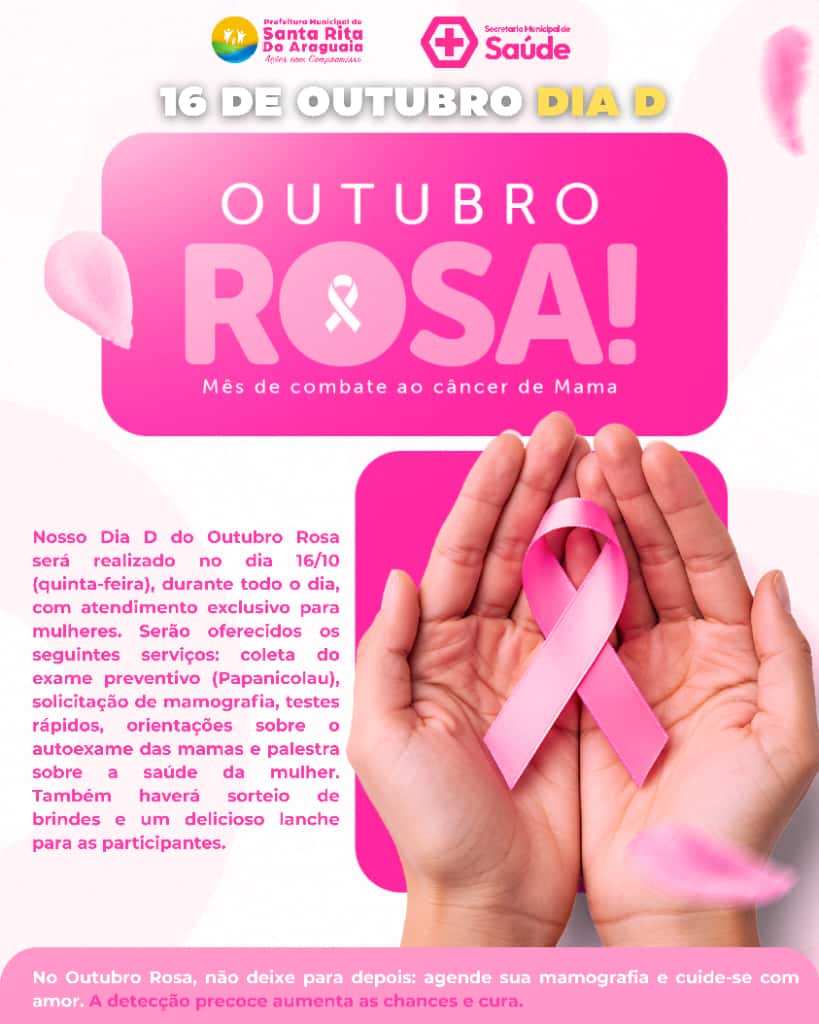 A Prefeitura de Santa Rita do Araguaia, por meio da Secretaria Municipal de Saúde, realiza no dia 16 de outubro (quinta-feira) o Dia D do Outubro Rosa, com atendimento exclusivo para mulheres.